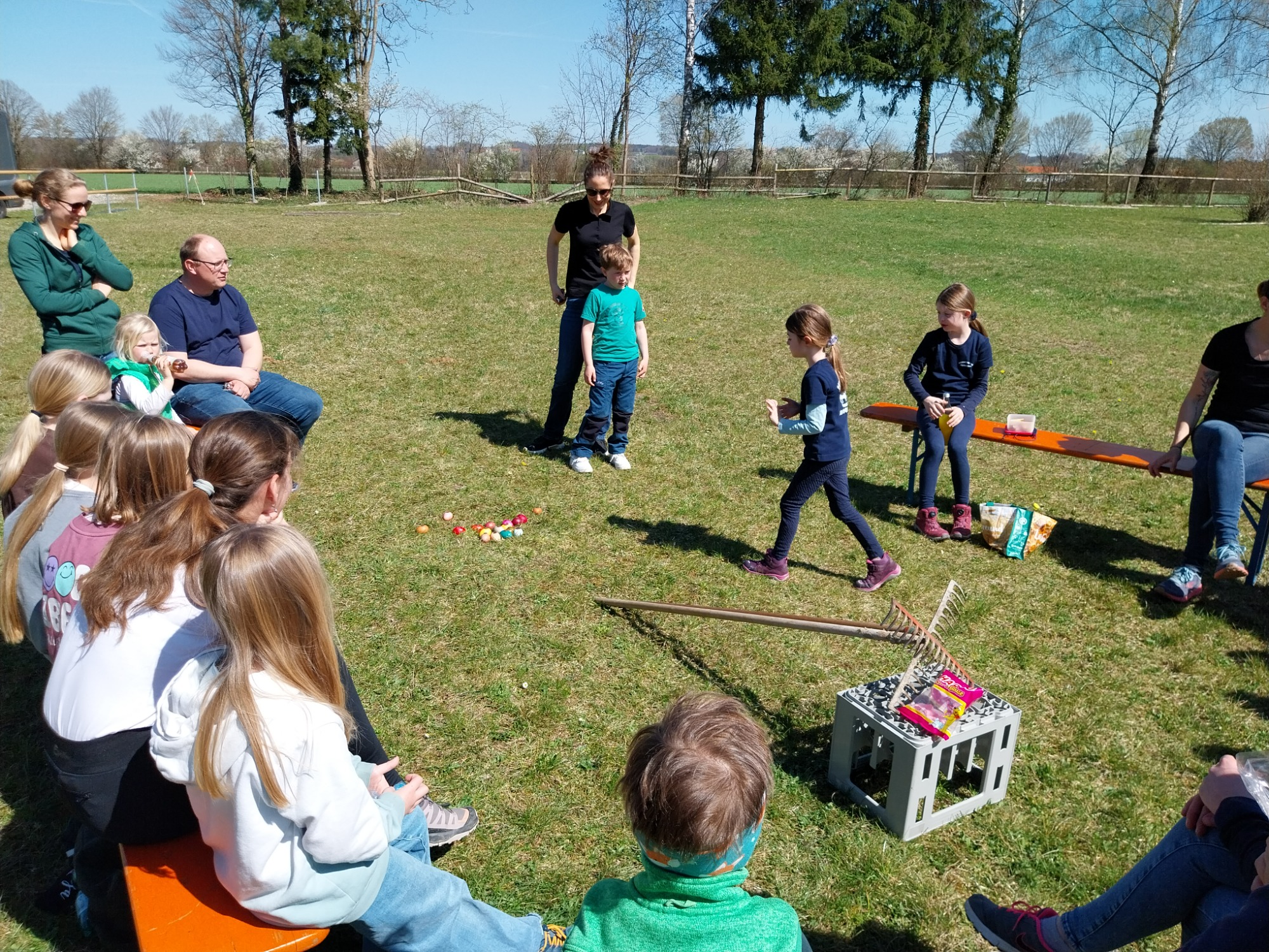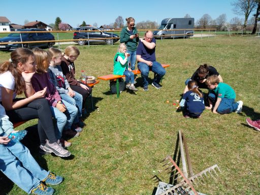 In den Osterferien lud Jugendwartin Victoria Obermeier zum Osterbrauch "Oascheim" ein. Am Reitplatz wurden zwei Rechen ineinander verhakt, so dass die Stiele eine Bahn bildeten, auf der die bunten Ostereier hinabrollen konnten. Nach und nach ließ jedes Kind bzw. jeder Erwachsene sein Ei hinabkullern. Wer dadurch ein anderes Ei berührte und den Cent zum Fallen brachte, bekam die Münze, die zuvor aufgelegt wurde. Nebenbei konnte man sich am bunten Häppchenbuffet stärken. Bei herrlichem Sonnenschein verging das lustige "Oascheim" wie im Flug!